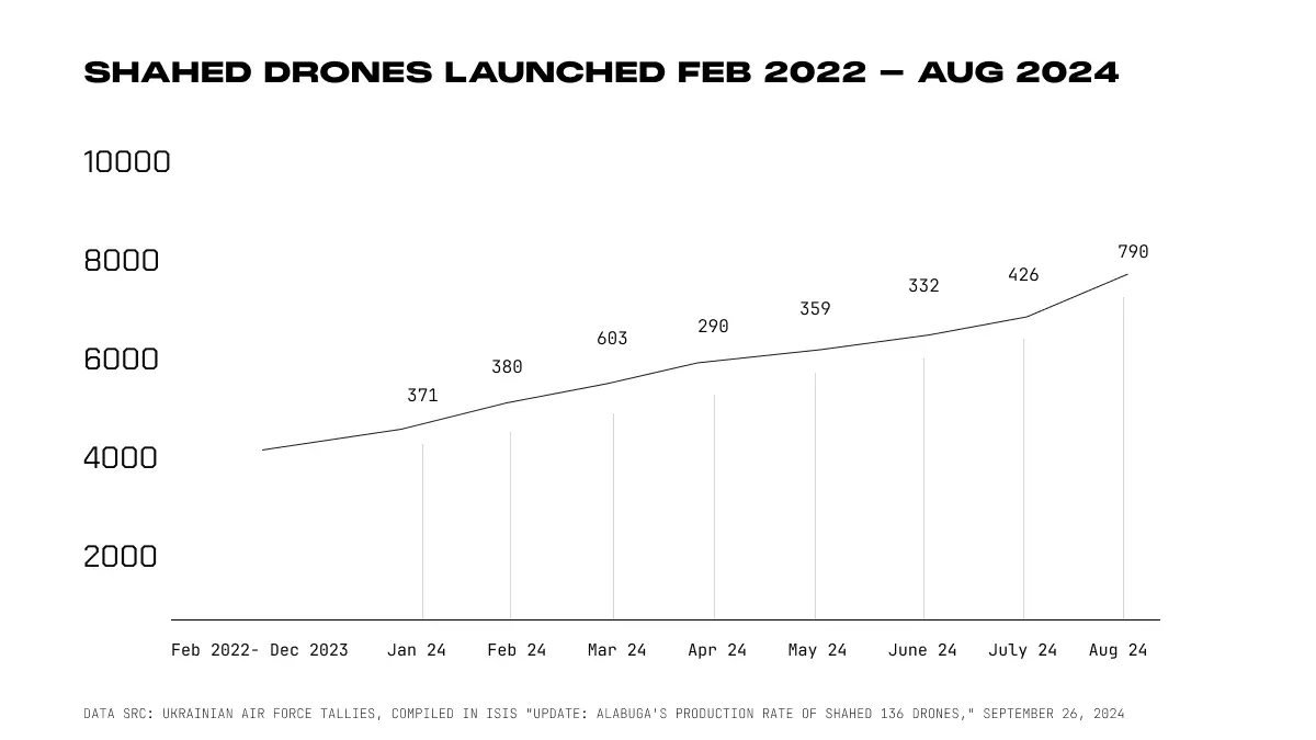 The average number of Shaheds per individual attack also rose sharply: from 14 drones per strike between April and September 2023, to 21 drones per strike from September 2023 through August 2024. [2]
